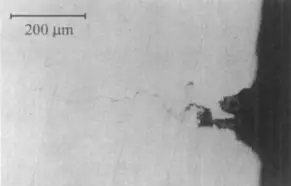 將點(diǎn)狀缺陷進(jìn)行縱向解剖,進(jìn)行顯微觀察,腐蝕孔的截面形態(tài)為腐蝕垂直于表面向縱深發(fā)展(圖2)。經(jīng)分析,坑底物質(zhì)主要是FeCl2•4H2O和Fe3O4,為腐蝕產(chǎn)物[1]。嚴(yán)重的小孔腐蝕還可能伴生氫脆或應(yīng)力腐蝕,所以這是一種危害很大的缺陷。